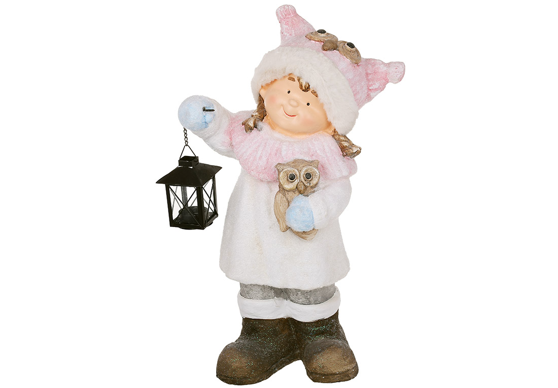Декоративна фігура Дівчинка з ліхтариком (свічка 40мм) у шапці Совушка, 51см, декор: сніг із флоку, хутро, гліттер