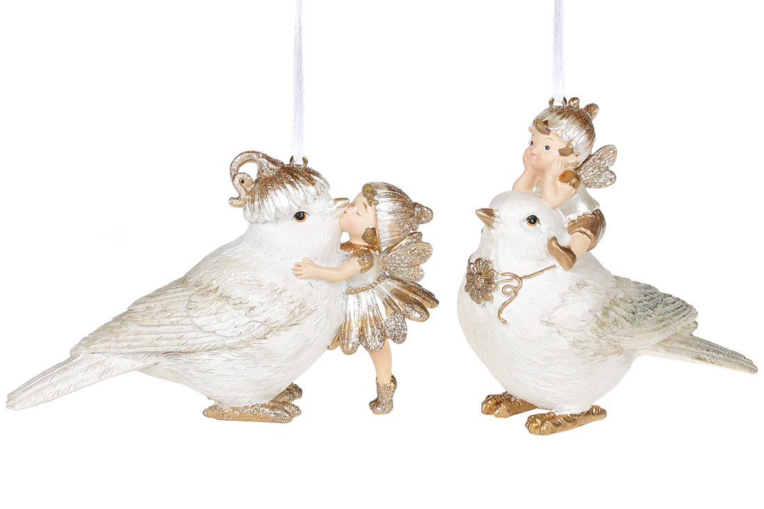 Декоративна підвісна фігурка Пташка з феєю, 10.8см, 2 дизайни, колір - білий із золотом