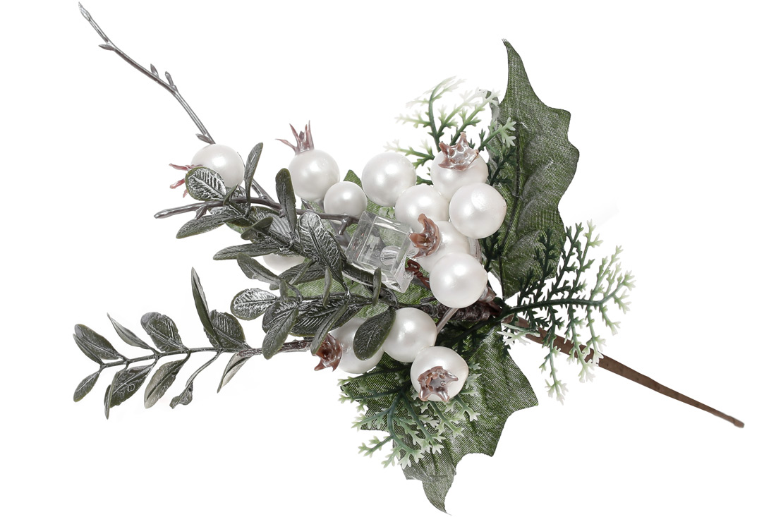 Декоративна гілка з хвої, білих перламутрових ягід, з кристалом та срібним покриттям, 25см.