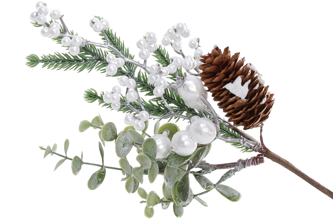 Декоративна гілка з листя та хвої, з білими ягодами та шишкою, 23,5см