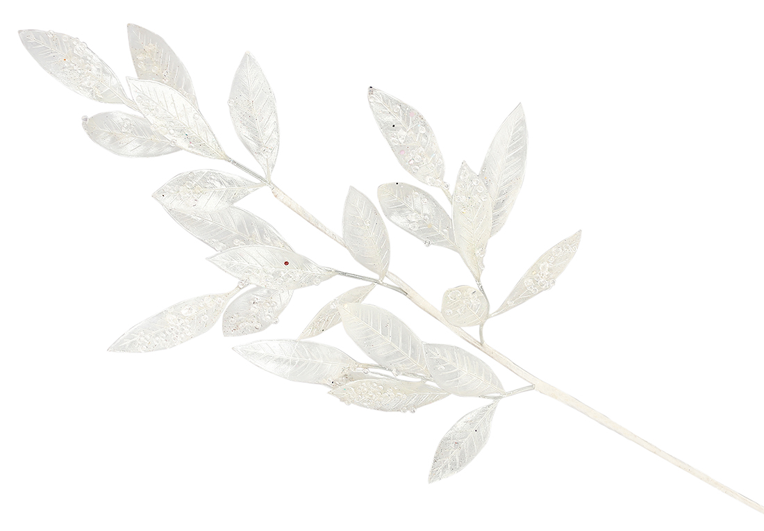 Декоративна гілка листя 68см, колір - білий перламутр з глітером