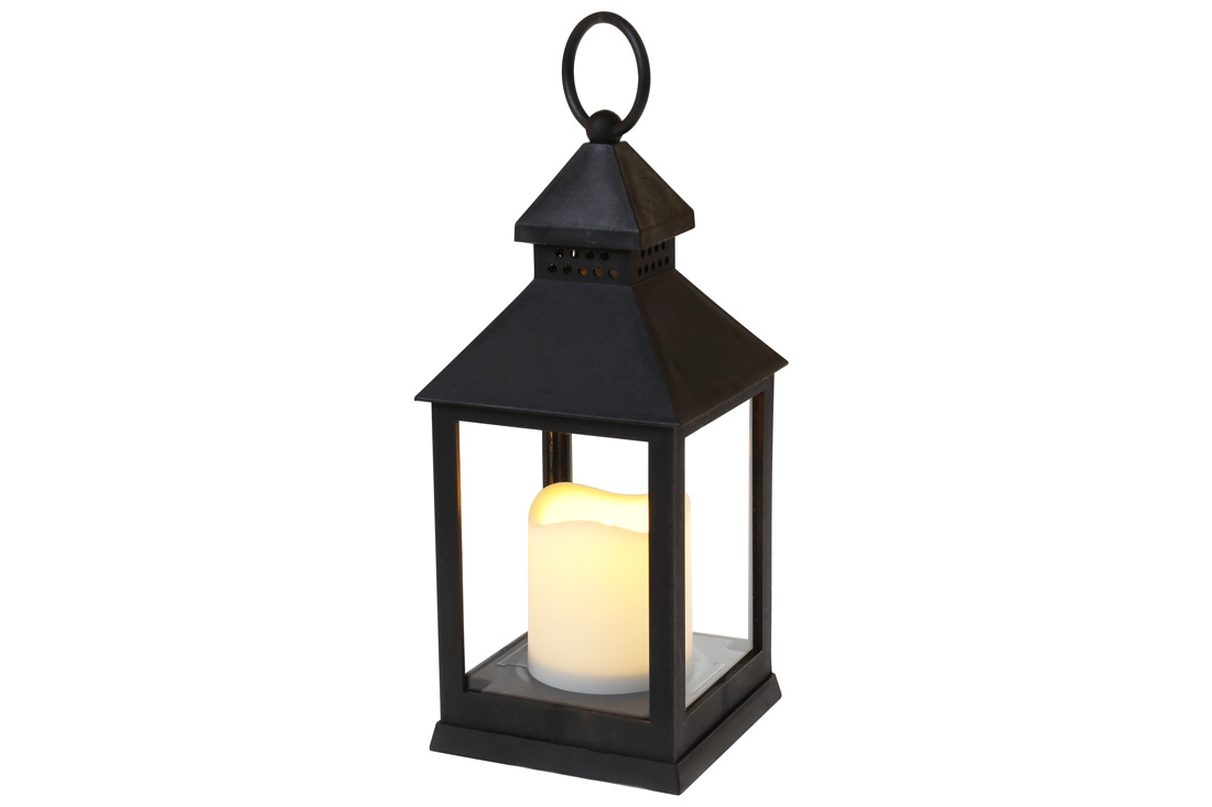 Декоративний ліхтар 24см зі свічкою з LED підсвічуванням (тепле біле мерехтливе світло) на батарейках (3хААА - не входять до комплекту), колір - чорни