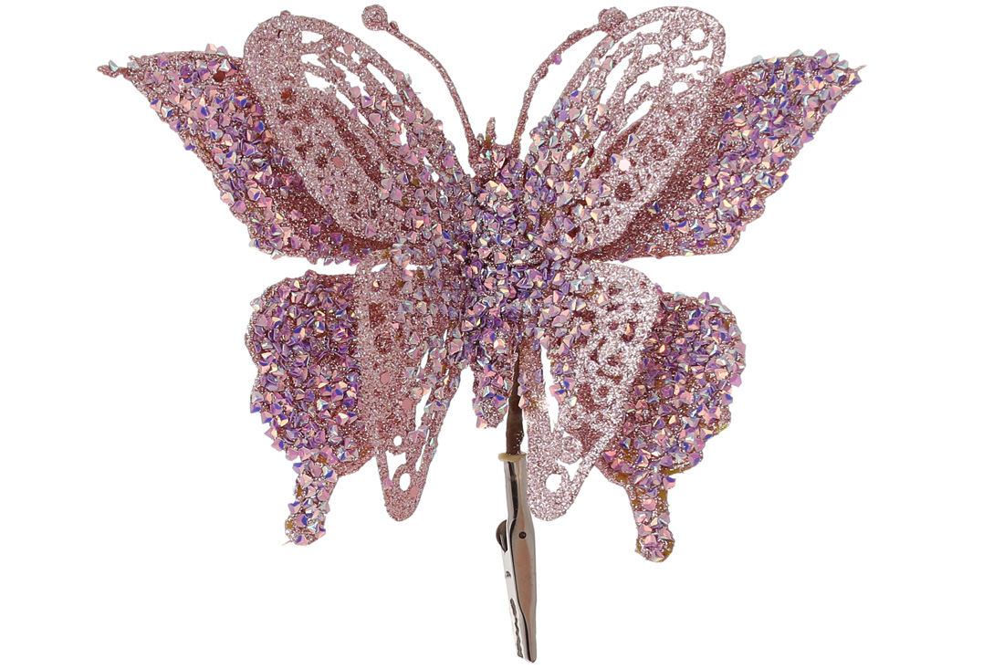 Ялинкова прикраса на кліпсі Метелик, 17см, колір - рожевий гліттер з лавандовою присипкою
