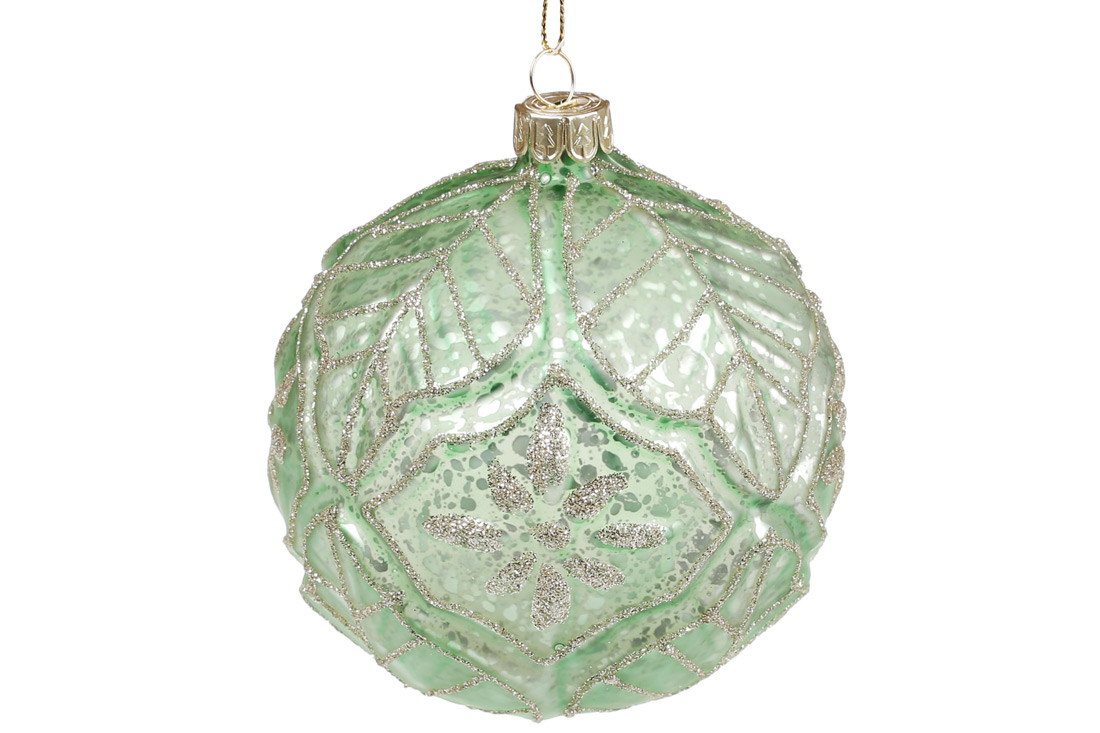 Ялинкова куля 10см рельфової форми з декором із гліттера, колір - трав'яний зелений