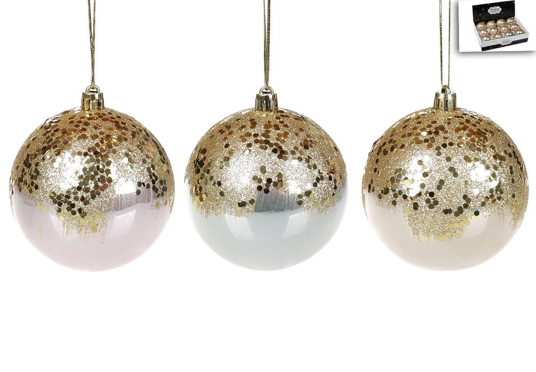 Ялинкова куля 8см, мікс 3-х кольорів перламутру із золотою присипкою в дисплей коробці: сірий, рожевий, шампань