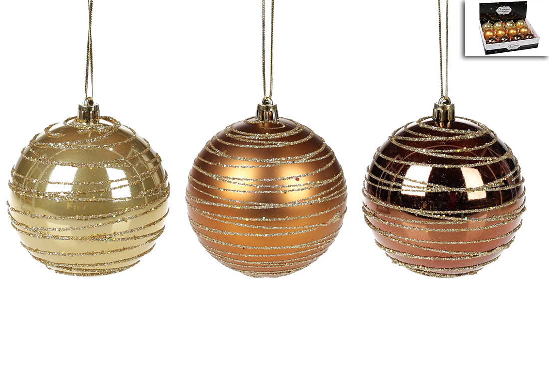 Ялинкова куля 8см, мікс 3-х кольорів в дисплей коробці: коричневий глянець, матова охра, золото - перламутр
