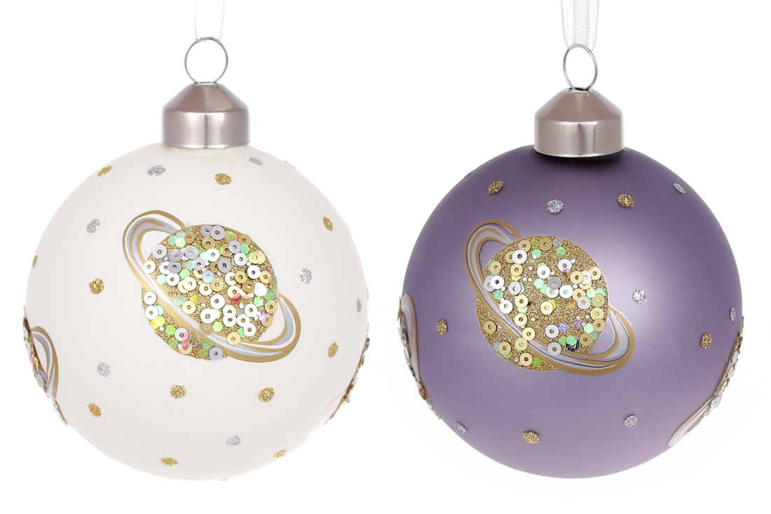 Ялинкова куля Планета Сатурн 8см з паєтками, колір - білий та фіолетовий, мікс 2 дизайнів в дисплей коробці