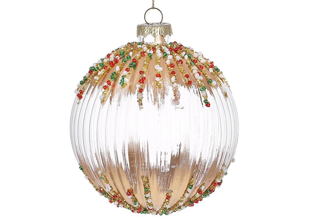 Ялинкова куля рельєфної форми з декором з бісеру 10см, колір - прозорий із золотом