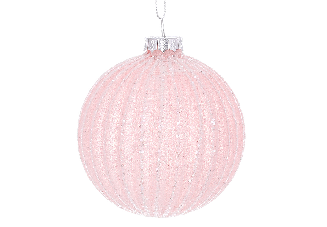 Ялинкова куля рельєфної форми з цукровим покриттям та гліттерним декором 8см, колір - блідо-рожевий