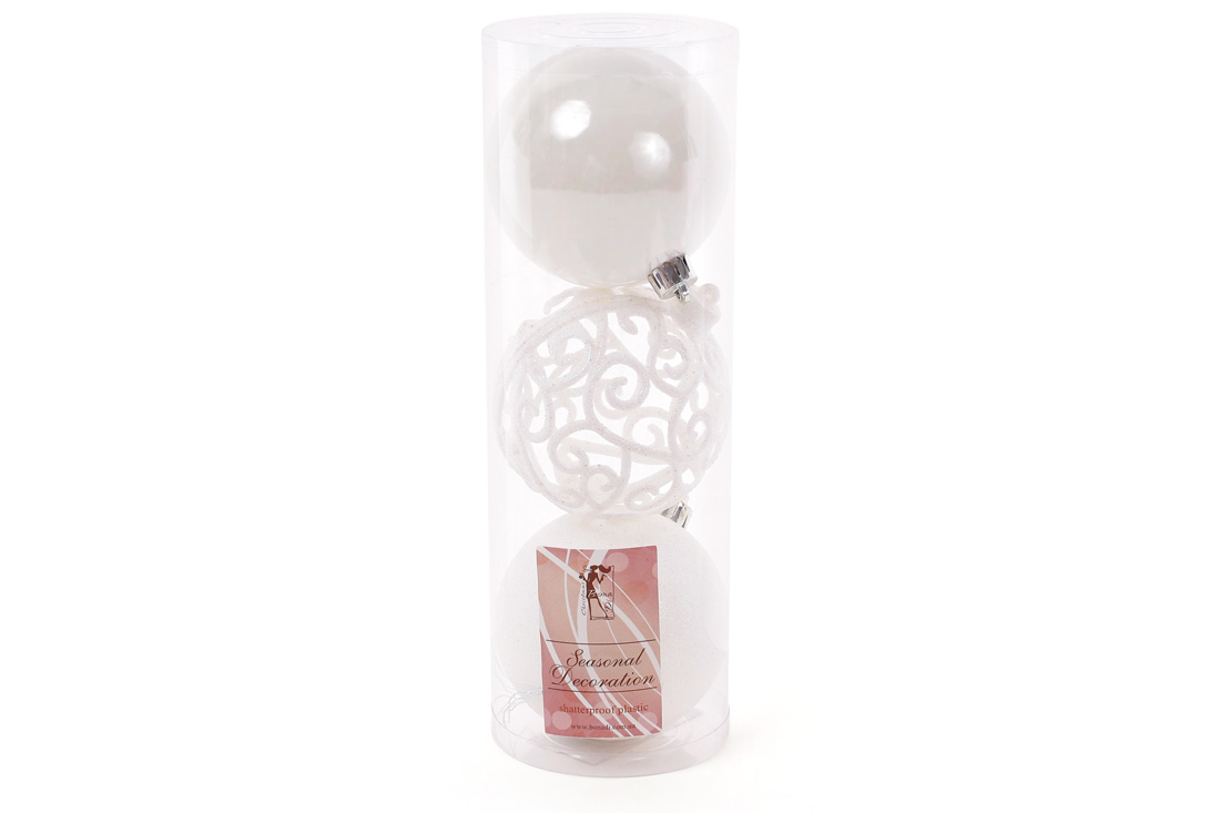 Набір ялинкових куль Ажур 8см, колір - білий перламутр, 3шт: перламутр, ажур з глітером, глітер