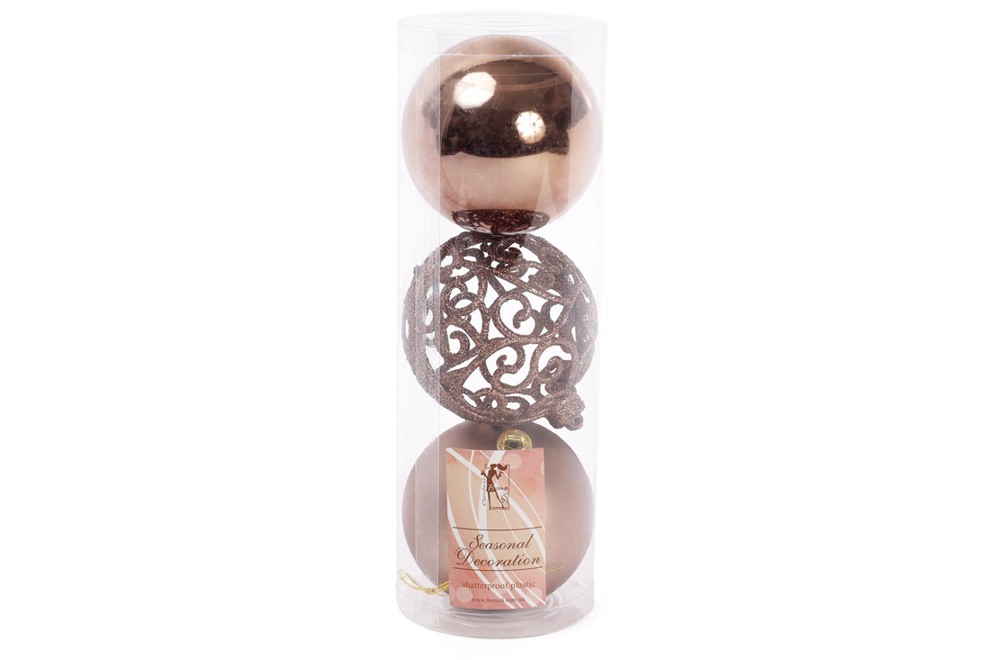 Набір ялинкових куль Ажур 8см, колір - карамельний мокко, 3шт: матовий, ажур з гліттером, глянець