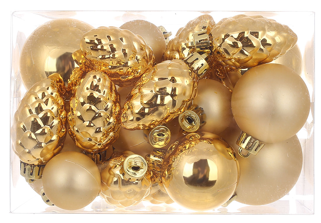 Набір ялинкових куль і шишок 25шт, колір - золото, Шишки: 4.5см - 10шт глянець, Кулі: 3см -5шт матові; 4см - матовий і глянець по 3шт; 5см - матовий і
