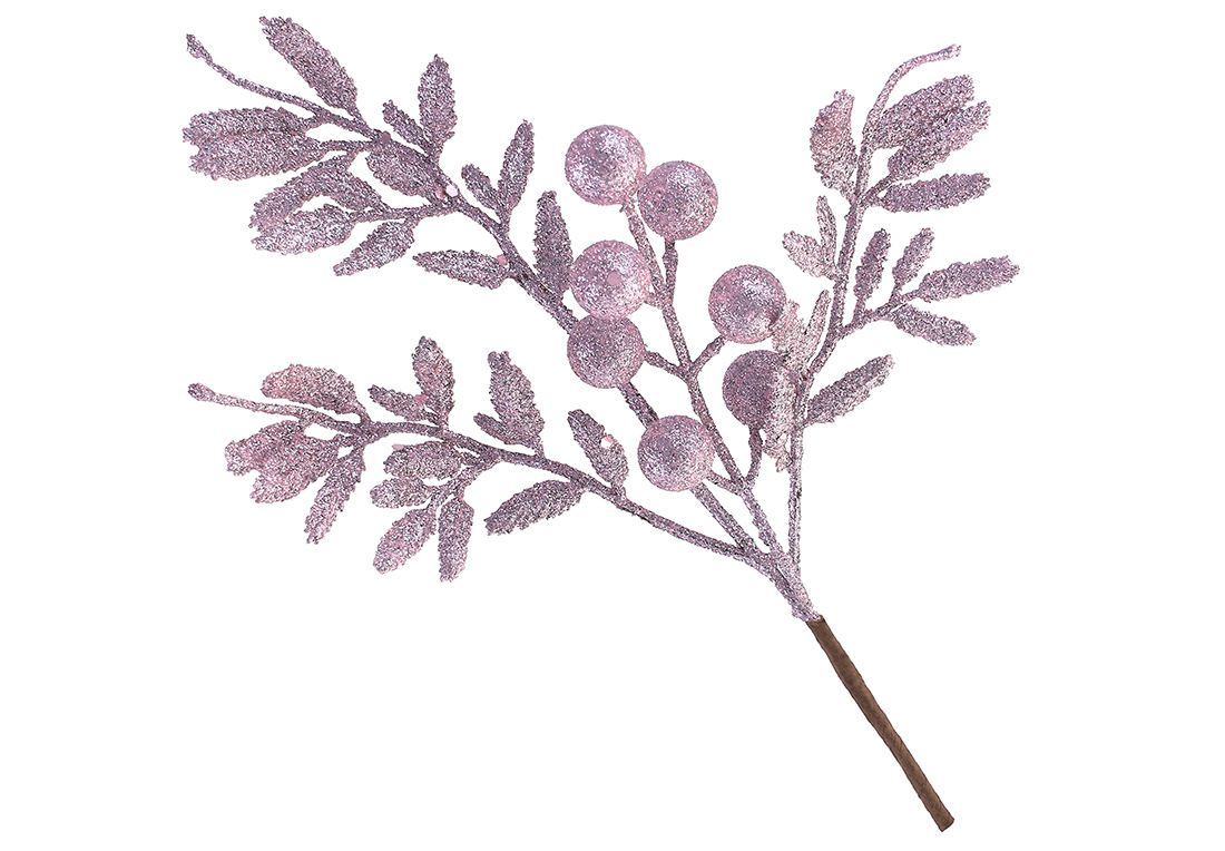 Гілка з листям та ягодами в гліттері 35см, колір - рожевий